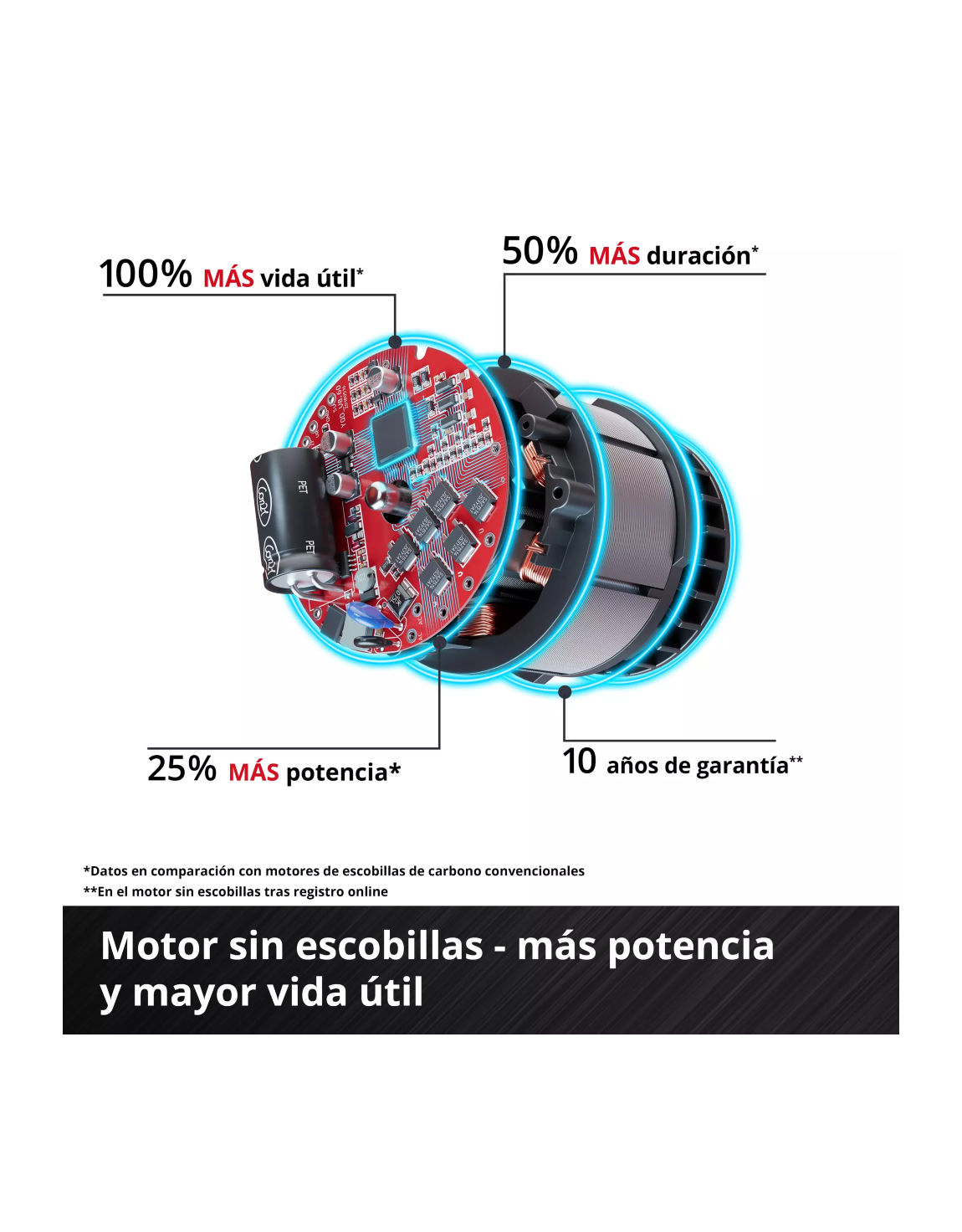 - Motor sin escobillas - más potencia y mayor tiempo de funcionamiento
